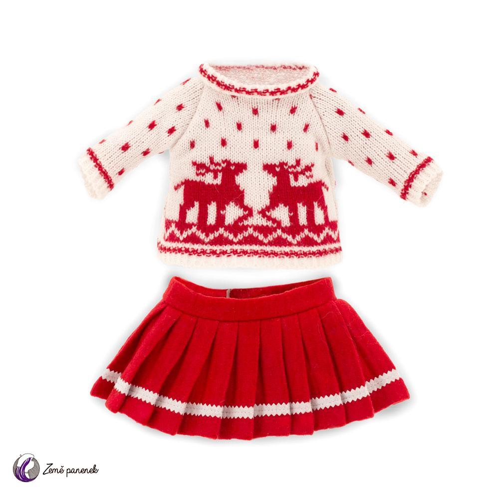 Obleček obsahuje červeno-bílý pletený svetřík a sukni.