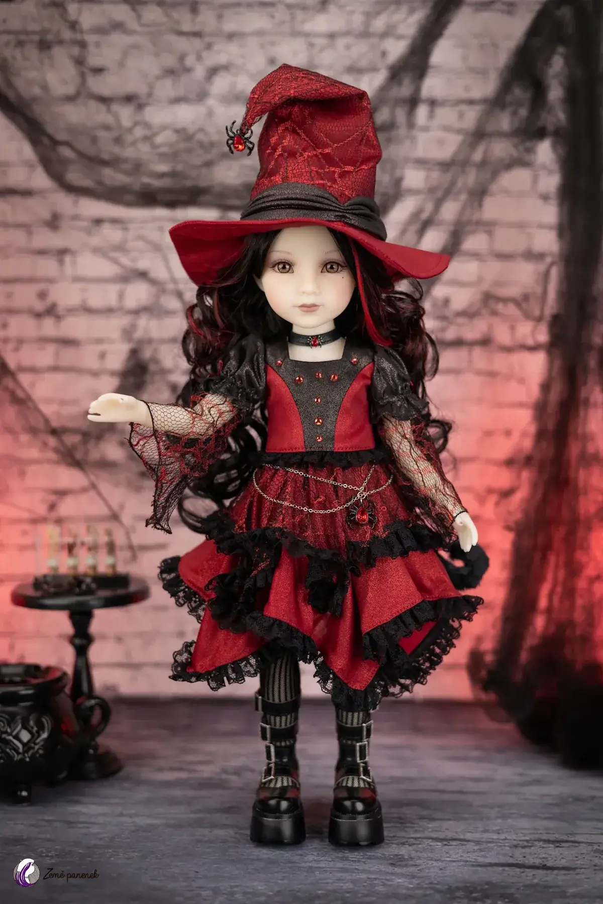 Její komplet zahrnuje černočervený top s černým olemováním a červenými kamínky. Unikátní rukávy kombinují nadýchaný černý design s volánkovými okraji a okouzlující síťovinou s pavučinovým vzorem. K tomu asymetrická sukně lemovaná krajkou a zdobená stejnou pavučinovou síťovinou. Vzhled doplňují pruhované punčochy nad kolena, výrazné boty na platformě a řetízek s pavoučím přívěskem.